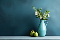Dit werk is een krachtige en sfeervolle interpretatie van een klassiek stilleven, vol kleur en textuur. Een weelderig boeket in een robuuste vaas en rijp fruit op tafel vormen het hart van de compositie. Het kleurenpalet is diep en rijk, met een nadruk op warme tinten zoals vurig rood, zonnig geel en aards oranje, die prachtig contrasteren met de diepblauwe en donkere schaduwpartijen. De stijl is expressief en bijna tastbaar, waarbij de vormen zijn opgebouwd uit gedurfde, zichtbare vegen in plaats van fijne details. Dit geeft het werk een enorme vitaliteit en een modern karakter, terwijl het toch de tijdloze charme van het genre behoudt. Het is een sfeervolle en artistieke toevoeging aan elk interieur, perfect voor het creëren van een warme, uitnodigende en klassiek-moderne sfeer.
