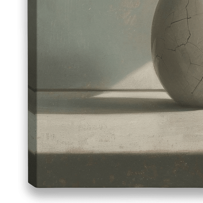 Stilleven - Dit stilleven schilderij toont een gebarsten vaas, een metalen kom en een glazen fles, uitgelicht door een diagonale lichtval die subtiele schaduwen creëert op een subtiel getextureerde achtergrond.