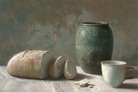 Stilleven - Dit stilleven schilderij toont rustiek brood naast een gebarsten groene vaas en een eenvoudige crèmekleurige mok op een stoffige tafel, waarbij de focus ligt op een verscheidenheid aan texturen en subtiele kleurnuances.