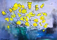 Dit gedurfde kunstwerk heeft een boeket felgele bloemen in een abstract voorgestelde vaas. De bloemblaadjes, zwart omlijnd, staan in schril contrast met de mistige blauwe en grijze achtergrond, waardoor een effect van dynamiek en beweging ontstaat. De kunstenaar gebruikt geëxplodeerde penseeltechnieken, waardoor het geheel een…
