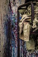 Stilleven van een detail in een drukkerij. Oude doeken waarmee de printplaten worden schoonmaakt bij elkaar verzameld. Ze hebben hun dienst gedaan. Spetters van inkt op de muur. Vergane glorie?