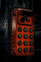 Detail in een drukkerij. Een oud intercomsysteem. Mooie kleuren in een donkere industriële ruimte. Een herinnering aan vervlogen tijden.