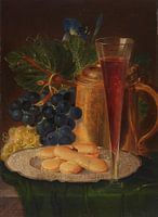 Stilleven met een prachtige bierpul, een fijn glas met drank, gebak en druiven, lange vingers, een vlieg en een hommel, THEODOR MATTENHEIMER, 1833