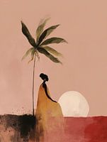 Een minimalistisch maar warm portret van een vrouw onder een tropische boom, terwijl de zon langzaam zakt aan de horizon. De zachte aardetinten en het silhouet geven het werk een serene, meditatieve uitstraling. Perfect voor interieurs die rust, warmte en een vleugje exotische sfeer willen toevoegen.