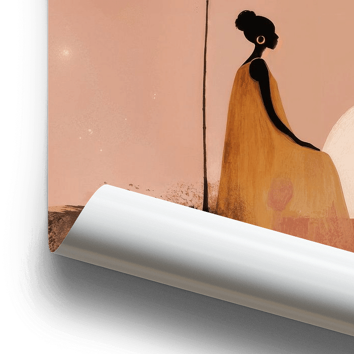 Een minimalistisch maar warm portret van een vrouw onder een tropische boom, terwijl de zon langzaam zakt aan de horizon. De zachte aardetinten en het silhouet geven het werk een serene, meditatieve uitstraling. Perfect voor interieurs die rust, warmte en een vleugje exotische sfeer willen toevoegen.