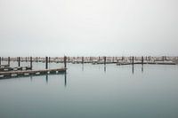 Een beeld van steigers in de haven van Lake Michigan, Chicago. Nog de stilte voor de drukte van de komst van boten gaat komen. Nevel en mist versterken de rustige sfeer.