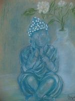 Pasteltekening van een Boeddha die ingetogen zit te mediteren. Een Boeddha is de rust zelve, ongenaakbaar voor alles om hem heen, in zichzelf gekeerd en in rust. Overdenkt alles van deze aarde . Een witte roos in een glazen fles staat achter hem.