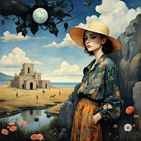 In Stilte aan de rand van de zee ontvouwt zich een droomachtige wereld waarin werkelijkheid en verbeelding samenvloeien. Een jonge vrouw, gehuld in een met bloemen bedrukte mantel, kijkt over een verstild landschap dat lijkt te ademen tussen verleden en toekomst. Achter haar rijst een oud bouwwerk…