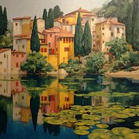Stilte aan het Water is een sfeervol kunstwerk dat de rust en charme van een Italiaans stadje aan het water vangt, met een vleugje Art Deco elegantie. In zachte pasteltinten zijn gele gebouwen met karakteristieke rode deuren weergegeven, omringd door bomen en grote, reflecterende waterlelies die als spiegels op de grond liggen. De compositie straalt een kalme, bijna dromerige stilte uit.