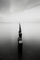 De afbeelding toont een serene en tijdloze scène van een rij standpalen die elegant uit het water oprijzen. Elk van deze palen staat dieper in het kalme water dan de vorige, waardoor een hypnotiserend perspectief ontstaat.