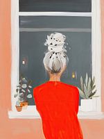 Dit kunstwerk legt een stil en intiem moment van stilte vast. Het portretteert een vrouw die van achteren uit een raam naar de avond staart. Gekleed in een levendig rood gewaad wordt haar figuur het emotionele middelpunt van de compositie, in kalm contrast met de gedempte grijze tinten van de nacht buiten. Het zachtjes opgestoken haar…