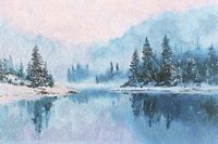 Een ijzig meer weerspiegelt de besneeuwde sparren langs de oever, terwijl een roze ochtendlucht de horizon zacht oplicht. De nevel hangt laag tussen de bomen, alsof het landschap zich nog niet volledig heeft ontvouwd. Alles is stil, alsof zelfs de tijd zich hier even inhoudt.