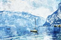 Een digitaal geschilderde idylle voert ons mee naar een rustig bergmeer. Een zeilboot glijdt majestueus over het spiegelgladde oppervlak. De besneeuwde toppen rijzen majestueus op in de achtergrond en verlenen de scène een sublieme rust. Het kleurenschema in zachte blauw- en groentinten onderstreept de vredige sfeer. Deze foto nodigt je…