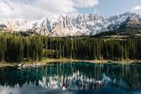 s Avonds bij het meer van Carezza wanneer het water op zijn rustigst is.