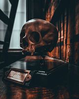 In een stille hoek van Marsh’s Library staat een schedel tentoongesteld tussen eeuwenoude boeken. Het zachte, warme licht benadrukt de vormen en texturen, terwijl de achtergrond vervaagt in schaduw. Dit beeld symboliseert vergankelijkheid, kennis en tijd.