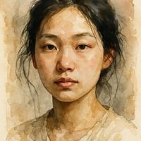 Dit portret vangt een moment van verstilling en puurheid. De zachte digitale aquarelstructuur benadrukt de kwetsbaarheid en innerlijke kracht van de geportretteerde. Met subtiele tinten en vloeiende penseelstreken ontstaat een intieme sfeer waarin emoties op een verfijnde en ingetogen manier worden uitgedrukt. Het werk ademt sereniteit en nodigt de toeschouwer uit tot reflectie
