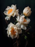 Een delicate compositie van ivoorwitte pioenrozen met een gouden hart, gevangen tegen een donkere, stemmige achtergrond. De zachte bloemblaadjes en het warme licht roepen tijdloze elegantie en natuurlijke sereniteit op.