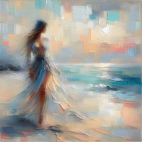 Een betoverend werk van een vrouw aan de waterkant, weergegeven in zachte, vloeiende lijnen en warme tinten. Haar silhouet wordt omlijst door een serene zee en een zachte, pastelachtige lucht. Haar houding straalt rust en introspectie uit, terwijl de natuurlijke omgeving haar tijdloze schoonheid benadrukt. Een intiem portret van kracht en sereniteit in harmonie met de natuur.