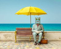 Geniet van de rust met deze minimalistische kunstfoto van een houten bankje onder een felgele parasol aan het strand. Ideaal voor wie zoekt naar serene stranddecoratie, moderne fotografie…