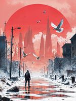 Dit intrigerende kunstwerk vangt de essentie van een post-apocalyptische sfeer in een surrealistisch en betoverend beeld. Een eenzame figuur staat in een besneeuwd, verlaten straat, omringd door vervallen gebouwen en kale bomen. De grote, rode zon domineert de achtergrond, werpt een zachte gloed en versterkt het gevoel van mysterie en melancholie.