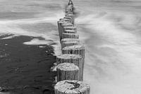 Deze zwart-wit foto toont een rij verweerde houten palen die zich als een ritmische lijn uitstrekken vanaf het zand de zee in. De palen, onderdeel van een oude golfbreker, lijken standvastig en tijdloos, terwijl het water eromheen in zachte nevel verandert door het gebruik van lange sluitertijd. De golven worden hierdoor niet als…