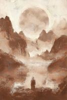 Een silhouet staat aan de rand van een vallei, omgeven door bergen en een lichtgevende zon aan de horizon. De kleuren zijn opgebouwd uit warme terracottatinten met zachte, penseelachtige texturen. De compositie is verticaal en leidt het oog via de figuur naar het lichtpunt in de verte.