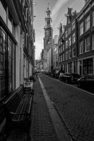 In een stille Bloemstraat in hartje Jordaan met op de voorgrond een bankje in antiekgroene kleur en die Ouwe Wester op de achtergrond. De stilte op straat geeft een extra dimensie aan dit werk, dat zowel in kleurvals zwart-wit verkrijgbaar is.