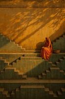 Een verstild moment gevangen in het warme licht van de ochtendzon. Een vrouw, gehuld in een diepe oranjekleurige sari, zit rustig op de geometrische trappen van een oude Indiase stepwell. De zon werpt lange, zachte schaduwen over de verweerde muren, waardoor het tafereel een bijna schilderachtige diepte krijgt.