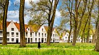 Dit beeld toont de verstilde sfeer van het Begijnhof in Brugge, waar natuur, architectuur en geschiedenis samenkomen. De frisse lentekleuren, de ritmiek van de bomen en de witte gevels zorgen voor een gevoel van rust en balans.