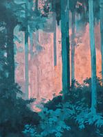 Zacht licht valt door de bomen in dit rustige boslandschap. De combinatie van koele blauwtinten en warme roze accenten creëert een subtiel contrast tussen schaduw en gloed. De eenvoudige compositie legt de nadruk op de stilte van het moment, waar het licht de bomen streelt en het bos een serene sfeer ademt.