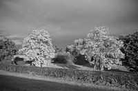 Een vredig veld, waar de bomen fluisteren in wit licht en de lucht haar geheimen bewaart in grijstinten. De natuur lijkt stil te staan, gevangen in een moment van verstilde schoonheid.