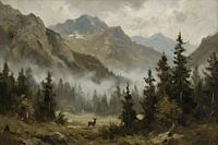Een rustgevend olieverfschilderij van een uitgestrekt berglandschap omringd door zachte, groene dennenbossen. De kleuren zijn bewust gedempt en natuurlijk gehouden, waardoor het werk een kalme en harmonieuze uitstraling krijgt. Een lichte nevel zweeft tussen de bomen en de berghellingen, wat diepte en mystiek toevoegt aan het tafereel.…