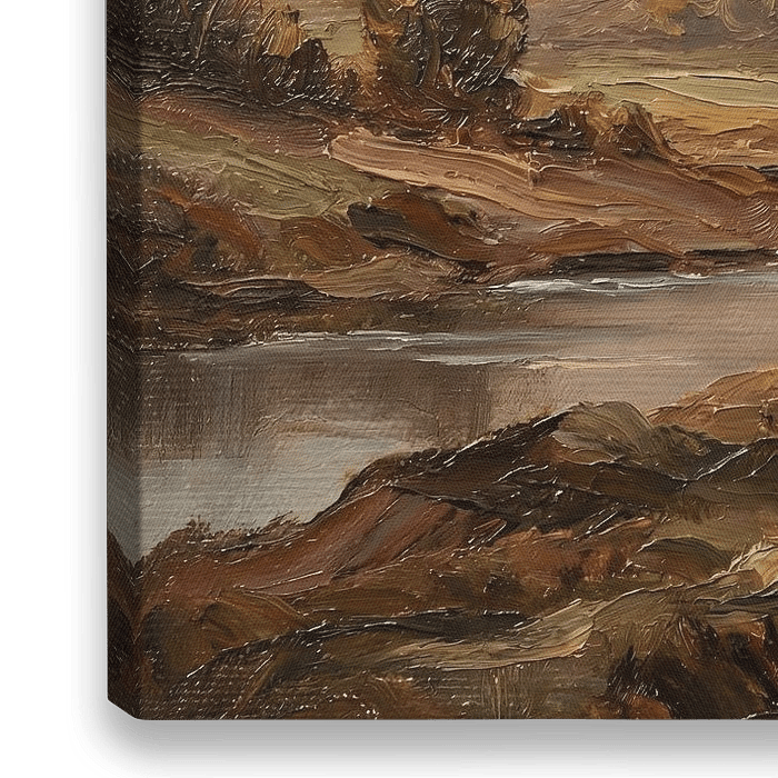 Dit kunstwerk toont een verstild landschap, geschilderd in de sfeer van een klassiek olieverfschilderij. De zichtbare penseelstreken en rijke textuur geven het werk een warme, handgeschilderde uitstraling. Zachte overgangen in kleur en licht creëren diepte en rust, waardoor het schilderij een tijdloze en serene sfeer uitstraalt. Een…