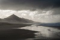 Het prachtige verlaten strand 'Playa de Cofete' in het zuiden van het Canarische eiland Fuerteventura. Een stormachtige lucht hangt onheilspellend boven de bergen en de zee. Het lijkt bijna een zwart wit foto, maar dit is een kleur foto, die door het tegenlicht en het donkere weer deze tinten kreeg.