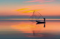 Dit rustgevende, vredige schilderij vangt een enkel, bijna meditatief moment waarop een visser, alleen op zijn boot, zich voorbereidt op de dag.
