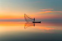 Dit rustgevende, vredige kunstwerk toont een vredig en stil moment net voor de aanvang van de dag, waar een visser in perfecte harmonie met de natuur staat.