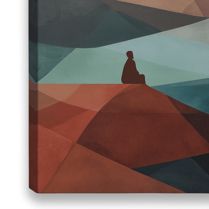 Dit minimalistische en abstracte kunstwerk toont een figuur in een ogenschijnlijk eindeloos landschap. Geometrische vormen bouwen de bergen op, terwijl een ronde zon erboven hangt als een rustig, centraal element. De aardse kleuren—bruin, grijs, beige, blauwgroen en rood—scheppen een kalme en ingetogen sfeer. Bovenop één van de…