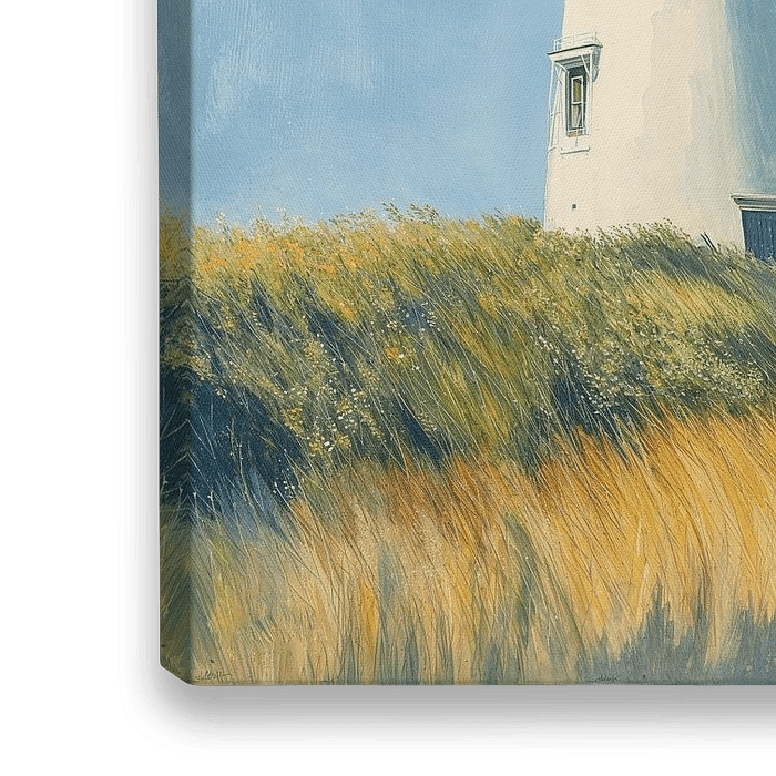 Het schilderij toont een majestueuze vuurtoren die trots op een ruige kustlijn staat. Omringd door zachte golven en steile rotsen straalt de vuurtoren een warm, uitnodigend licht uit dat de kijker betovert. Het kleurenpalet wordt gekenmerkt door zachte blauw- en grijstinten die de melancholische stemming van de zee weerspiegelen,…