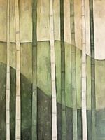 Langwerpige vormen strekken zich verticaal uit, als bamboe in een verstilde bosrand. De kleuren lopen in elkaar over van zacht olijfgroen tot gebroken wit, met hier en daar een diepere schaduw die de diepte aanraakt.