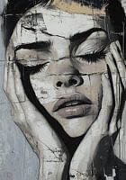 Stel je een zwart-wit portret voor dat een diep en aangrijpend moment van verdriet vastlegt. In het centrum van dit schilderij zien we een vrouw met een expressie van stille wanhoop en melancholie. Haar gesloten ogen, een symbool van interne strijd en verdriet, benadrukken haar emotionele toestand. Ze leunt haar hoofd op haar handen,…