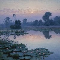 In dit schilderij wordt de rust van een mistige ochtend bij een vijver vastgelegd. Waterlelies drijven kalm op het oppervlak terwijl de zon langzaam opkomt, gehuld in zachte tinten van roze en blauw. De serene reflecties van de bomen en de wolken in het water creëren een gevoel van harmonie en stilte. Dit landschap nodigt uit tot…