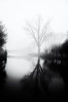 Een kale boom staat in de dichte mist aan het water van een vijver. In de verte is nog een bruggetje zichtbaar. Beide spiegelen mooi in het stille water, want het is mistig en windstil. Deze boom vond ik aan de ML. Kinglaan in Purmerend.