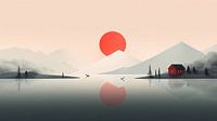 Het kalme water van het meer reflecteert een landschap van sublieme schoonheid, met een grootse rode zon die balanceert op de top van een silhouet van bergtoppen. Een eenzame rode hut aan de oever biedt een vleugje beschaving in dit overwegend wilde tafereel, wat een gevoel van afzondering en rust oproept. De bomen op de kleine eilandjes en langs de oevers staan onbeweeglijk, bijna eerbiedig voor de ontluikende dag.