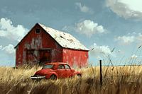 Een landschapschilderij in de stijl van Edward Hopper, met een verlaten schuur en een verroeste auto. De scène straalt een diep gevoel van eenzaamheid en verlatenheid uit terwijl de zon langzaam over de verweerde structuren beweegt. Het contrast tussen de rust van het landschap en het verval van de gebouwen en de auto versterkt het gevoel van vergankelijkheid en melancholie. De lege vlakten van het landschap benadrukken de stilte en afzondering die op dit moment zijn vastgelegd.