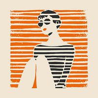 Dit grafische werk toont een vrouw in gestileerde pose, gezeten met opgetrokken knieën voor een fel oranje achtergrond vol horizontale lijnen. Haar korte haar, ronde zonnebril en gestreepte top geven haar een uitgesproken retro-charisma, terwijl de combinatie van zwart, beige en oranje een krachtig en harmonieus kleurenpalet vormt.