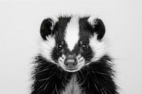 Dit indrukwekkende zwart-wit portret van een stinkdier legt de karakteristieke strepen en doordringende blik van het dier tot in detail vast. De contrastrijke lijnen benadrukken de opvallende verschijning en geven de afbeelding een speciale diepte en aanwezigheid. Dit kunstwerk is perfect voor liefhebbers van dierenfotografie en decoratieve kunst en geeft je woon- of werkruimte een unieke en stijlvolle uitstraling.