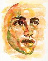 Portret van een persoon met een blik gericht op de horizon. Schilderij, aquarel in warme tinten. De blik geeft niet precies aan waar de gedachten zijn, zodat je er je eigen interpretatie aan kan geven en kan wegdromen over je eigen leven.
