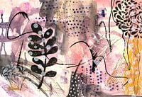 Foto met gemengde techniek. Aquarel, texturen, botanische vormen en goudapplicatie