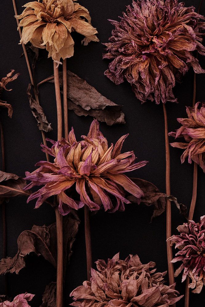 Prachtig schilderachtig stilleven van gedroogde dahlia's op een zwarte achtergrond.