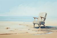Een abstract schilderij van een stoel op het strand in beige en blauw tinten. Rustige uitstraling.
